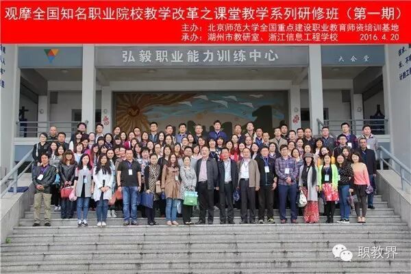 由北京师范大学全国重点建设职业教育师资培训基地主办,湖州市职业教育教研室、浙江信息工程学校承办的第一期“观摩全国知名职业院校教学改革之课堂教学研修班”已于2016年4月20日正式开班,22日圆满结束。此次观摩教学活动历时4天(杭州报到1天),参加此项研修活动的人员包括来自上海、广东、山东、四川、湖北、黑龙江、山西、辽宁等省市近百名教育局主管领导、职业院校校长、主任、骨干教师等。
